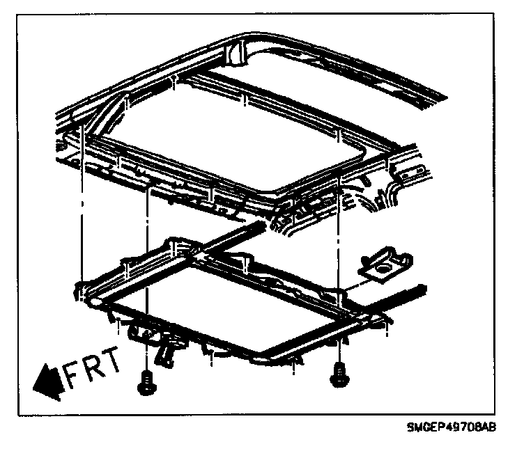 7. Adjust sunroof glass to 1 mm (0.040 in.) below roof surface at front and 1 mm (0.040 in.) above roof surface at rear by loosening sunroof glass attaching screws and moving sunroof glass.