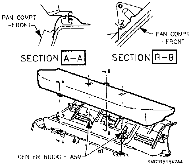e. Position rear edge of rear seat cushion onto rear compartment ramp. Route seat belt buckles through rear seat cushion opening. Make sure that the seat belts are not twisted or that the buckles are not stuck beneath the rear seat cushion.