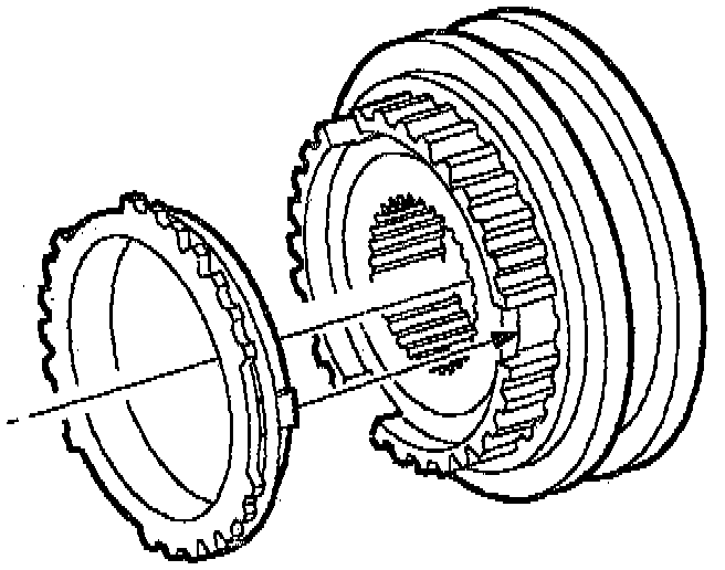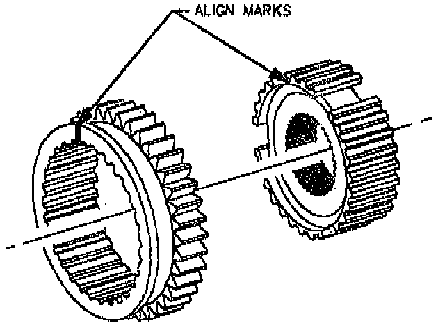 IMPORTANT: Be sure tabs on blocker ring are aligned with slots on hub (3rd / 4th synchronizer shown, 1st / 2nd synchronizer similar).