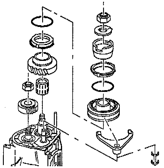 10. Remove 5th/Reverse shift fork, 5th/Reverse synchronizer sleeve, 5th/Reverse hub, blocker assembly, and 5th drive gear.