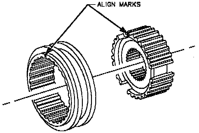 IMPORTANT: Synchronizer hub and sleeve must be kept together as a matched set. (3/4 synchronizer shown, 5th/Reverse synchronizer similar.) If alignment marks are not visible, put new marks on hub and sleeve before they are separated.