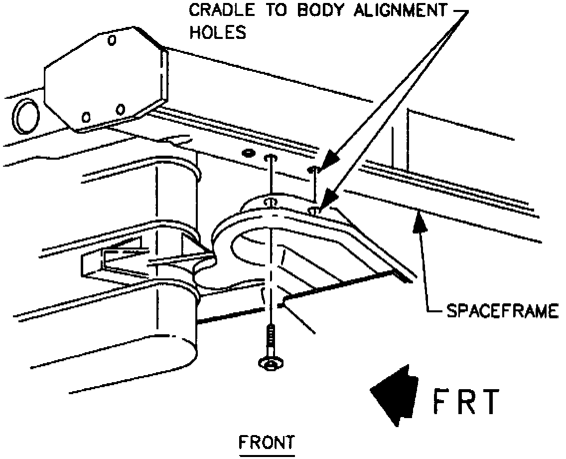 Check cradle to body alignment at two alignment holes using 5/16 inch rod,