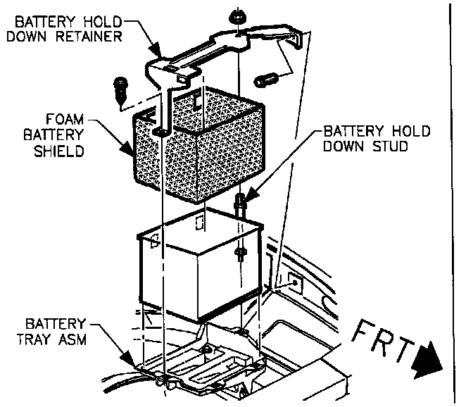 5. Install the foam battery shield and battery hold-down retainer. Tighten the hold-down retaining nut and screws.