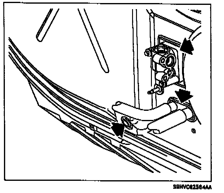 4. Position hose so that the water flows through air inlet grille, into the plenum area, and out plenum drains over HVAC module seals (TXV seal, heater core pipe seal, and case drain seal).