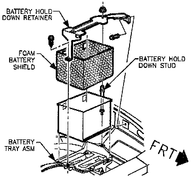 41. Install battery hold-down retainer, locking the battery into the tray. Install and tighten the hold-down retainer nut and screw.