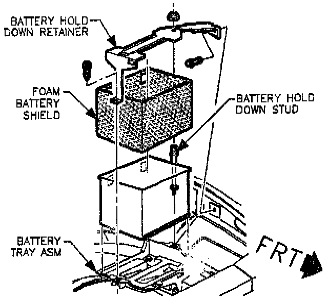 5. Remove hold-down retaining nut and screw, and lift off battery hold-down retainer.