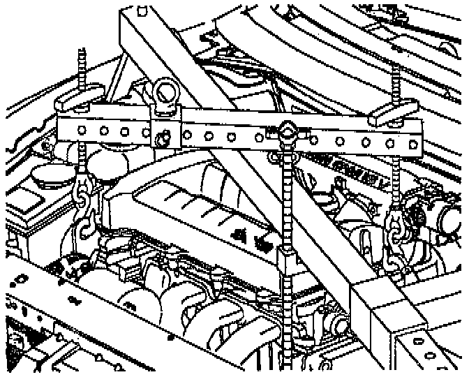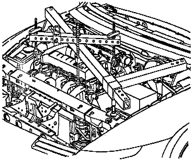 a. Place engine support bar in vehicle as shown. Place the support bar feet on the outer edge of the shock tower.