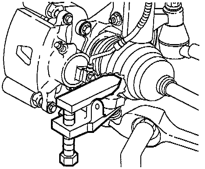 NOTICE: On ABS equipped vehicles, the outer CV joint has a speed sensor ring. Using the incorrect tool or procedure to separate the control arm from the knuckle can damage the ring, resulting in a loss of ABS operation.