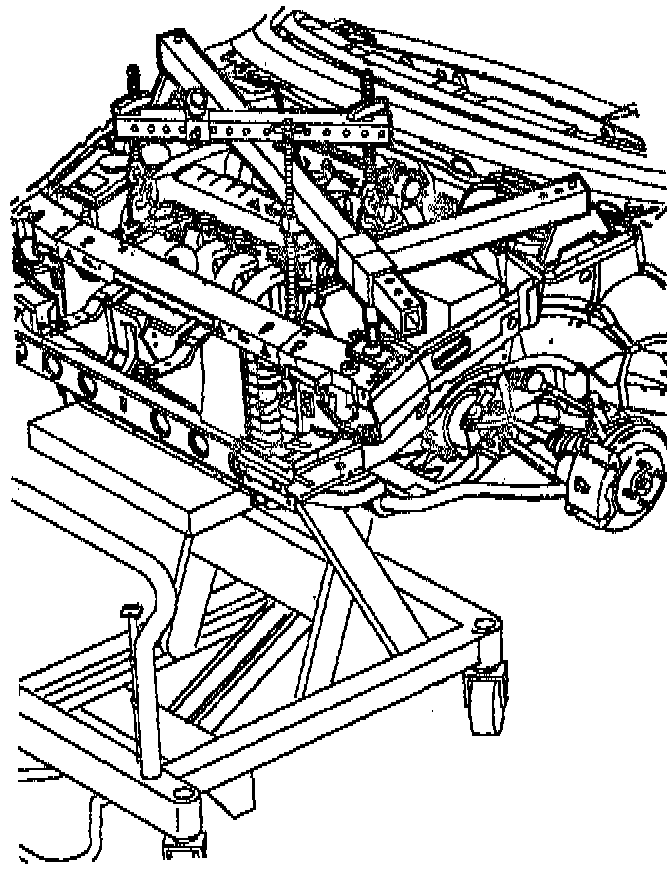 48. Use the powertrain support dolly and two 4 in. x 4 in. x 36 in. pieces of lumber to support the cradle on the dolly.