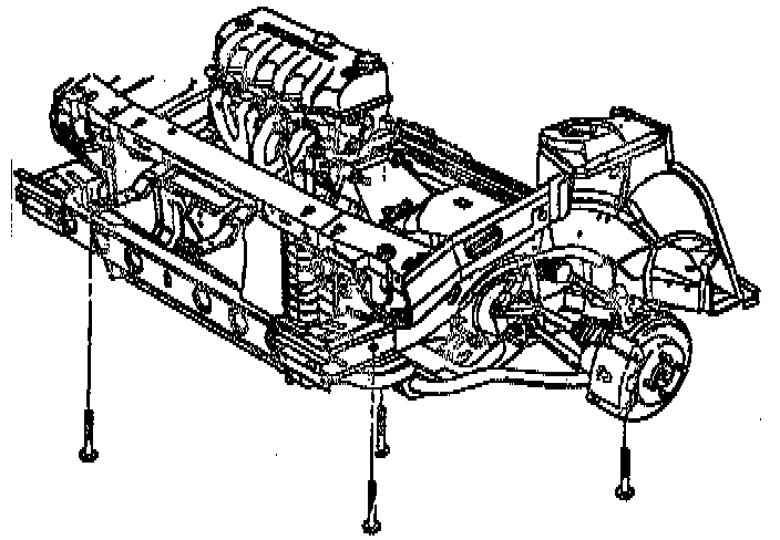 49. Remove the four cradle-to-body bolts. Carefully lower the cradle from the vehicle with the powertrain support dolly.