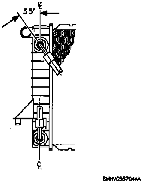 12. On vehicles with automatic transaxle, install and tighten upper transaxle oil cooler line. Install upper transaxle oil cooler line at a 35 degree angle and hold while tightening. Torque to 30 Nm (22 ft. lbs.).