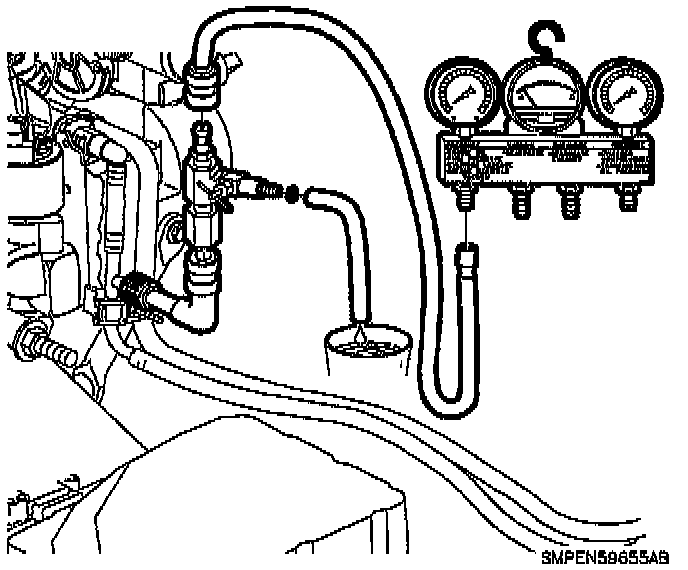 b. Perform a four hour fuel pump leak down test. Attach the gage bar kit (Saturn Tool) SA9127E to the inlet line.