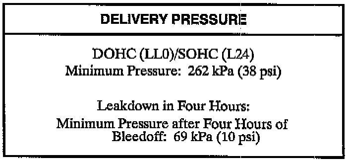 Cycle ignition key On/Off several times (do not start engine) and record maximum pressure. Cycle the key On and Off several times (fuel pump must cycle On/Off a minimum of three times) to establish an accurate reading. Allow gage pressure to stabilize for thirty seconds. Refer to readings in chart: