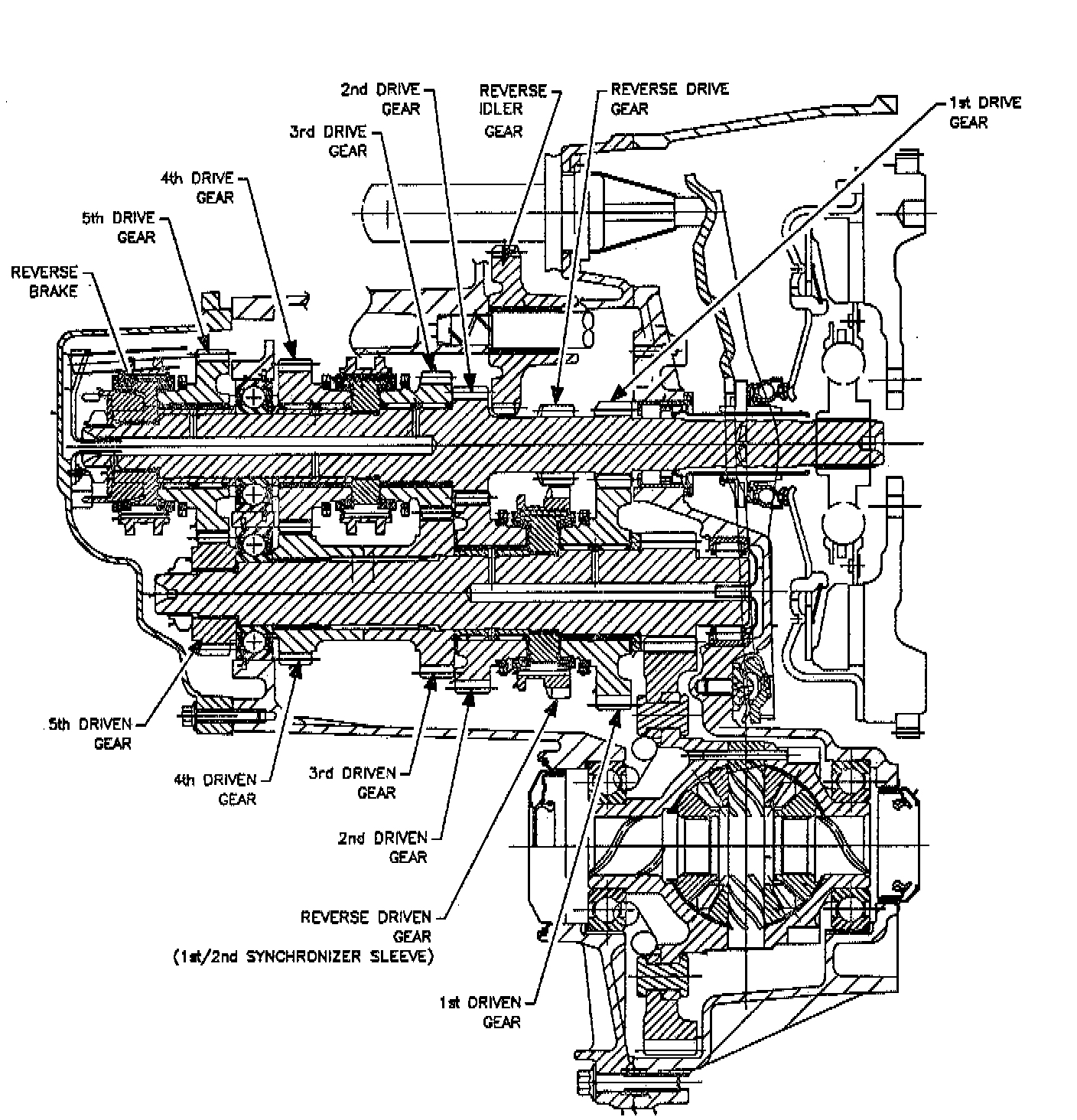 1st Gear: In 1st gear range, the 3rd/4th and 5th synchronizers are in neutral and the 1st/2nd synchronizer sleeve is moved to the right to engage the 1st speed blocker ring and the 1st gear. Because the 1st/2nd synchronizer hub is splined to the output shaft, torque is transmitted from the input gear through 1st speed gear, the synchronizer sleeve and hub, the output shaft, and into the differential (final drive) assembly.
