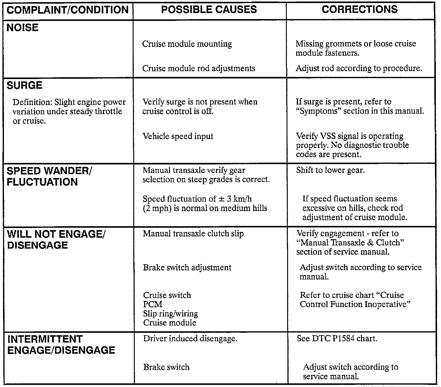 Cruise Control Complaint/Condition Chart