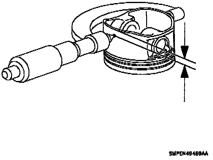 2. Inspect piston diameter and oil clearance using a micrometer, measure the piston diameter at a right angle to the piston pin hole center line, 5 mm (0.20 inch) from the bottom of the piston.