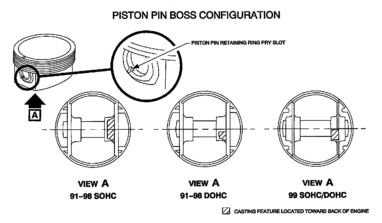 Important: If the pistons are already installed in the bores and orientation is being verified, look at the underside of the pistons to ensure the piston pin boss with the rectangle-shaped casting feature is pointing toward the back of the engine (refer to illustration).