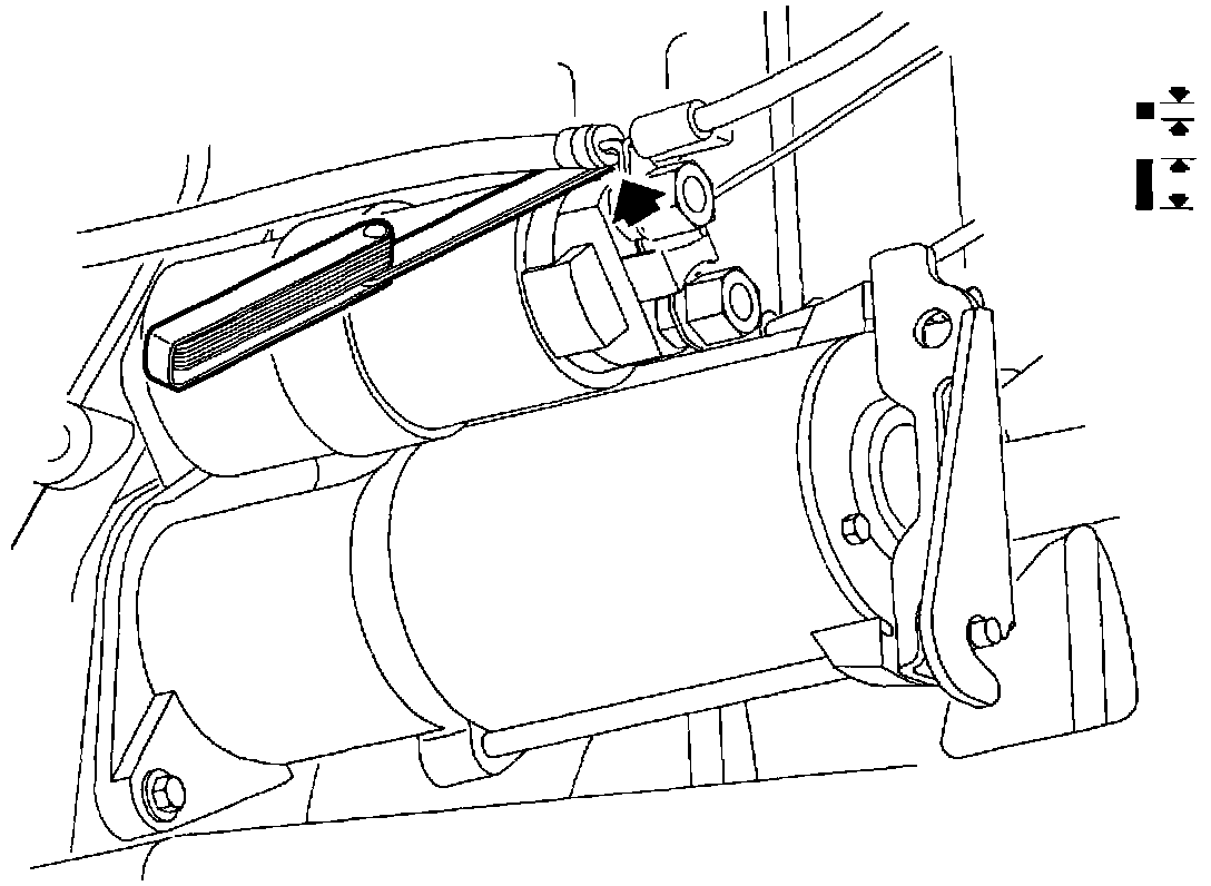 7. Use feeler gages stacked to 2 mm (0.080 in.) to verify that distance between rubber insulator on battery positive cable and metal housing on starter motor solenoid is greater than 2 mm (0.080 in.) and less than 6 mm (0.240 in.).