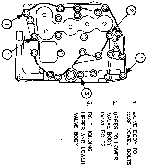 2. Install and finger tighten valve body-to-case dowel bolts first. This procedure must be followed to assure valve body is properly aligned to the case.
