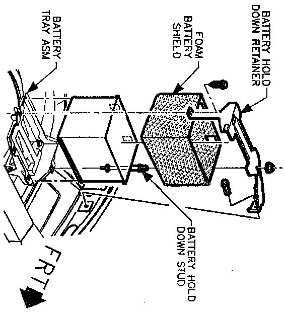17. Install the battery hold-down retainer, locking the battery into the tray. Install and tighten the hold-down retainer nut and screw.