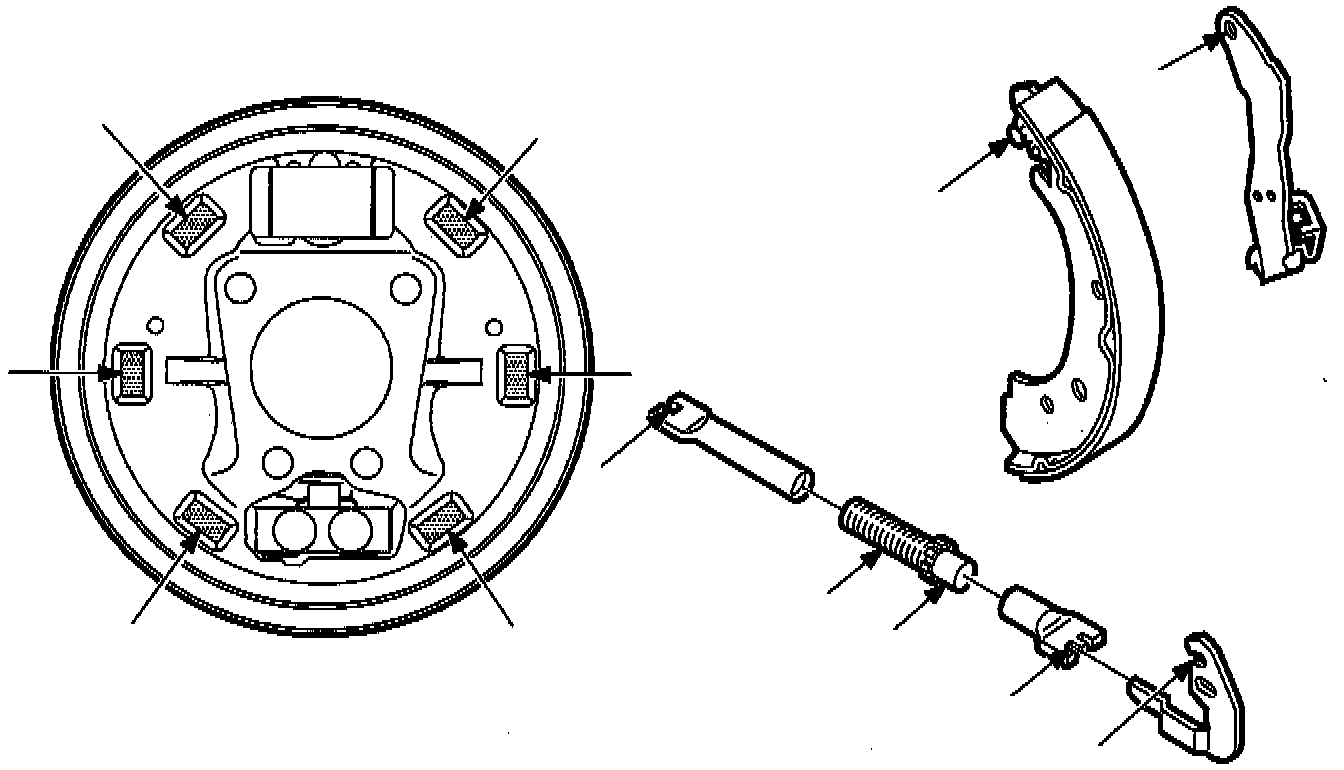 ^ Never replace brake shoes/linings on one side of axle only. Brake shoes/linings must be replaced as axle sets.