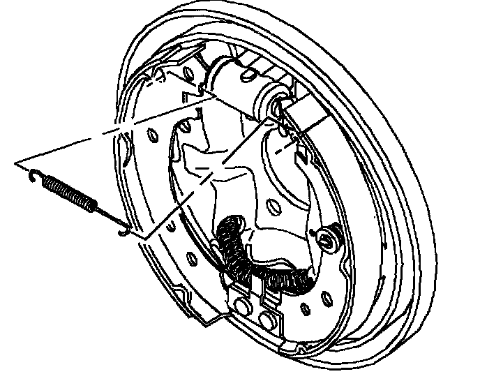 6. Install long, straight end of upper return spring into back of hole in park brake shoe.