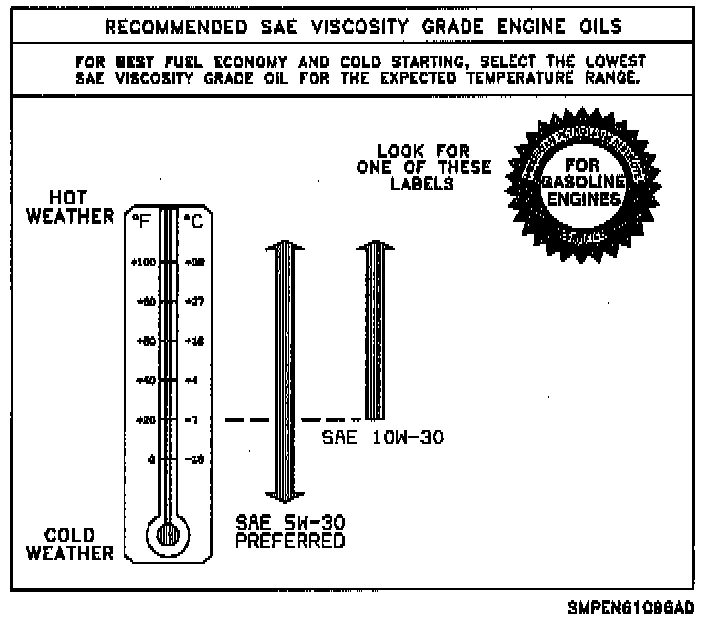 CAUTION: Use only oil with the American Petroleum Institute Certified for Gasoline Engines "Starburst" symbol. Failure to use the recommended oil can result in engine damage not covered by your warranty.NOTE: As shown in this chart, SAE 5W-30 is best for your vehicle. However, you can use SAE 10W-30 if it's going to be 20° F (-7° C) or above. These numbers on an oil container show its viscosity, or thickness. Do not use engine oil with viscosity rating such as SAE 10W-40, SAE 20W-50 and 30W as it does not meet recommended requirements.