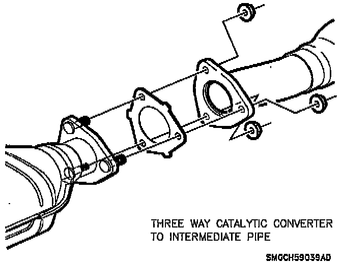 NOTE: Do not bend the front exhaust pipe or hanger attached to the engine stiffening bracket when servicing the front exhaust pipe and/or three way catalytic convertor. Bending the bracket or pipe may cause premature failure.