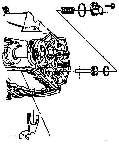 4. Remove the forward/reverse servo piston cover bolts, remove cover, servo piston spring, servo piston bolt, and shift fork.
