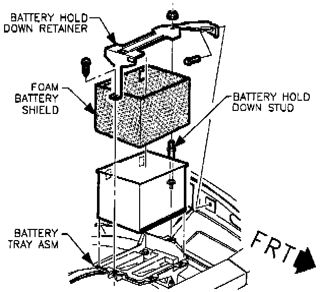11. Install the battery hold-down retainer, locking the battery into the tray. Install and tighten the hold-down retainer nut and screw.