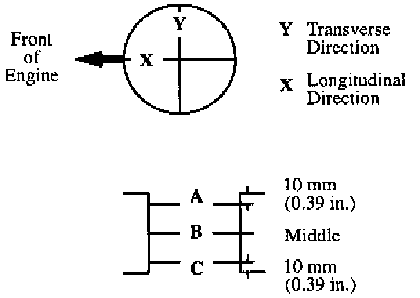 Using a cylinder bore gauge, measure the cylinder bore diameter at positions A, B. and C in the transverse and longitudinal directions. Record these dimensions.