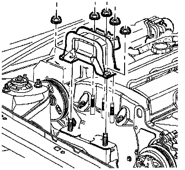 NOTICE: To prevent engine front cover and mount damage, the three front upper mount to engine front cover nuts must be tightened down uniformly.