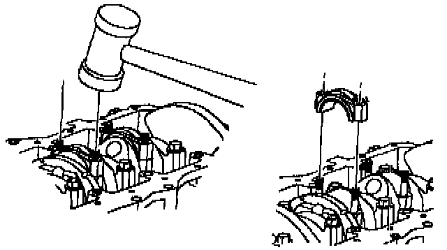 a. Using the main bearing cap bolts, move the cap back and forth, to loosen and remove the cap and bearing. Bolts can be tapped lightly with a plastic hammer.