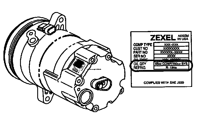NOTICE: PAG oil charge can be identified by locating the label on the rear of A/C compressor. The 65cc PAG oil charged service replacement A/C compressor will read "65cc COMP/150cc SYS" (150cc oil charge in the total system for the model year serviced). Improper quantity of oil charge in the system will degrade performance.