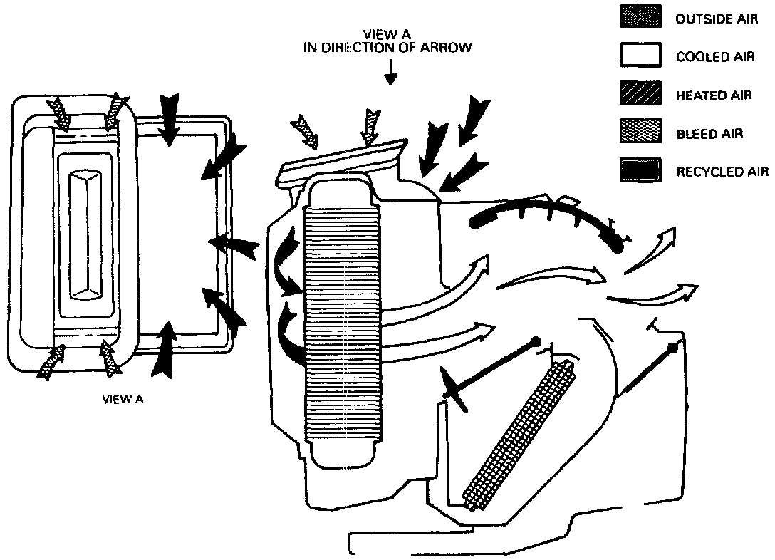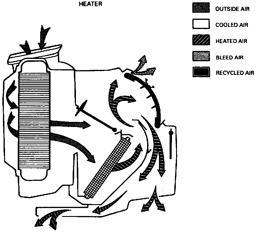 When Heater mode is selected, with Recirc off, outside air enters the module and passes through the evaporator core. With A/C button off the air is no cooler or drier than when it entered. When the temperature lever is moved from cold to hot, the temperature valve directs some or all of the air from the evaporator through the heater core, warming the air passing through it. The mode valve closes and directs most of the warmed air to the lower and rear air outlets. A small amount of bleed air exits through the defroster ducts.