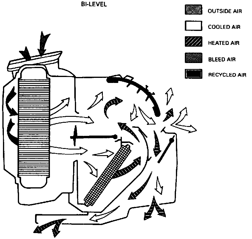 When selecting the Bi-Level mode, air enters the module and passes through the evaporator core. Depending on temperature lever position some air may pass through the heater core. This air will then mix with the cooler air and then be discharged through the instrument panel and heater outlets.