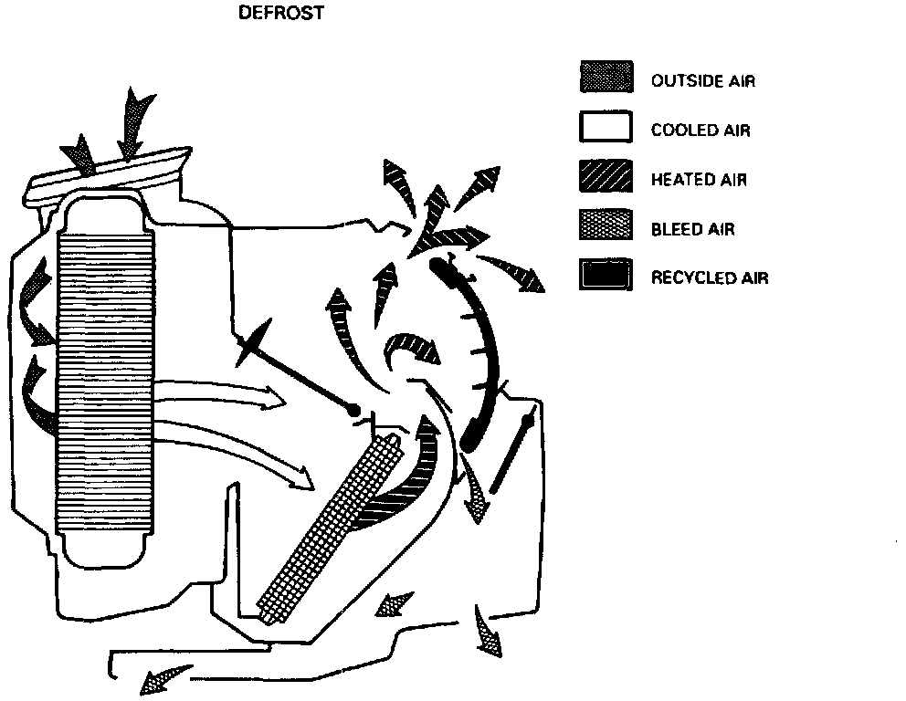 When the Defrost mode is selected, outside air enters the module and passes through the evaporator core. The air then passes through the heater core where it is heated. For maximum defrosting or in high humidity conditions do not engage the Recirc button. After the air passes through the heater core most of the air is directed through the mode valve to the defroster outlet. A small amount of bleed air will pass by the mode valve and out the lower air outlet. The figure shows air flow with the temperature lever set to full hot.