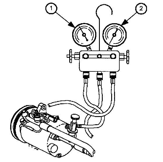 If an A/C system problem still exists after you have completed the preliminary checks, more diagnostic tests must follow. These include manifold gauge set readings. Follow the steps listed below for installing a manifold gauge set.CAUTION: ALWAYS WEAR GOGGLES AND WRAP A CLEAN CLOTH AROUND FITTINGS, VALVES, AND CONNECTIONS WHEN PERFORMING WORK THAT INVOLVES OPENING THE REFRIGERANT SYSTEM. ALSO, BEWARE OF THE DANGER OF CARBON MONOXIDE FUMES BY RUNNING THE ENGINE IN CLOSED OR IMPROPERLY VENTILATED GARAGES.