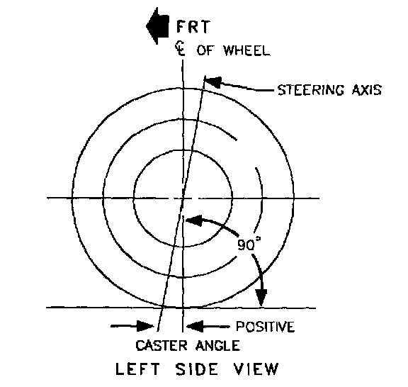 Caster is a measure of the angle between the steering axis and vertical when viewed from the side of the vehicle with the wheel in the straight ahead position. The steering axis is determined by the location of the lower control arm ball joint and the center of the strut-to-body attachment. A line drawn through the center of the ball joint and the strut-to-body joint represents the steering axis. When the center point of the strut-to-body attachment is rearward of the ball joint, the caster is positive. When the center of the strut-to-body attachment is forward of the ball joint, the caster is negative.