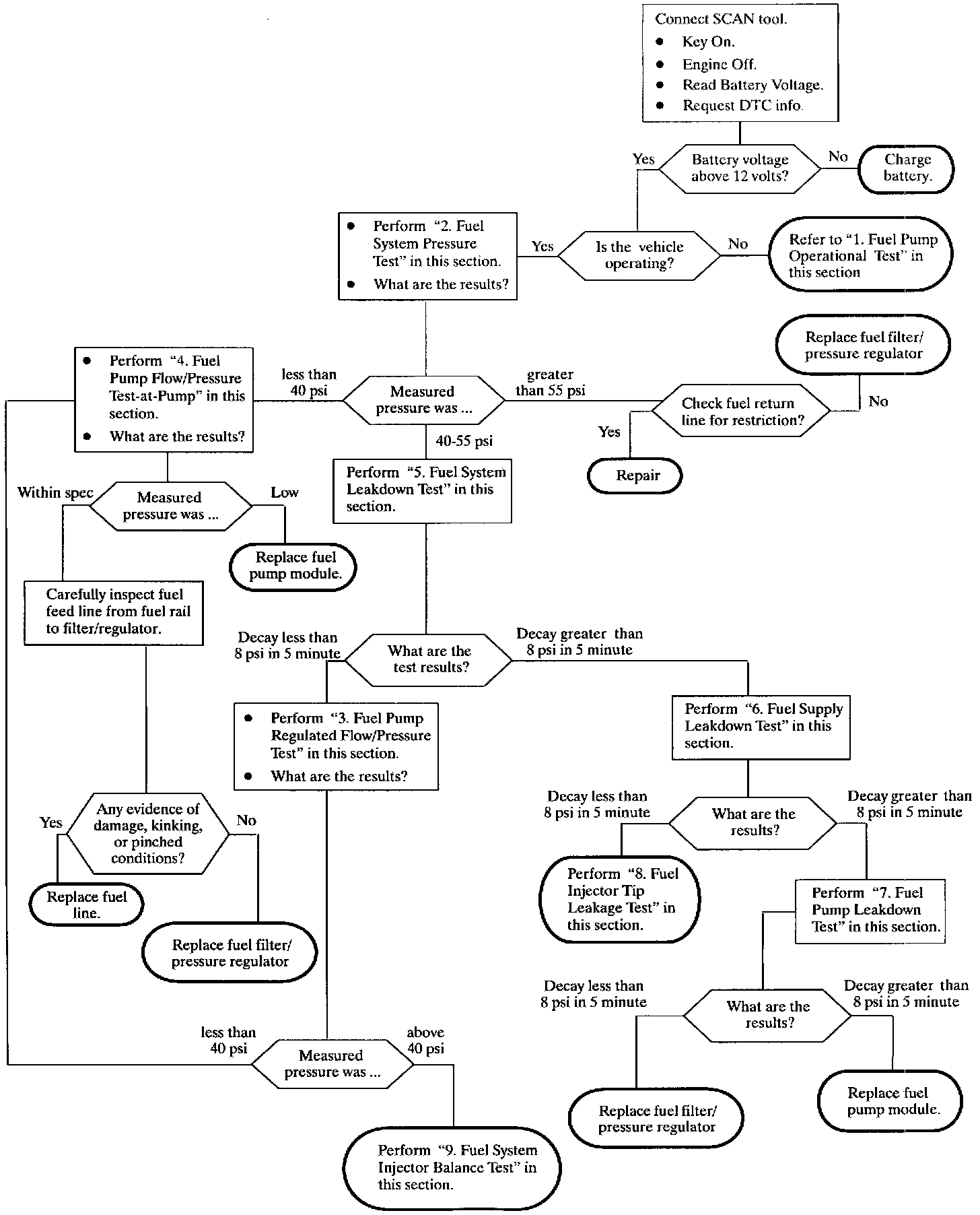 The fuel system tests outlined in the fuel system diagnostic flow chart and detailed procedures (Tests 1 - 9) provide a systematic approach to determining whether the fuel system, from fuel pump to fuel injectors, is functioning as intended.