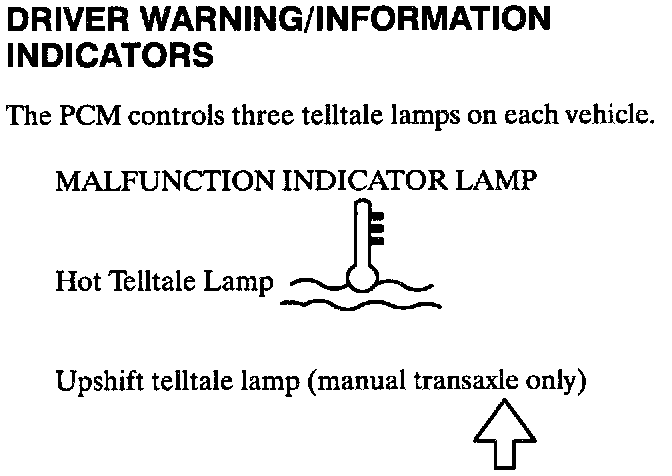 The upshift telltale lamp is used, on vehicles equipped with a manual transaxle, to signal the driver to upshift the transaxle. Shifting each time the upshift telltale lamp comes on will obtain maximum fuel economy.
