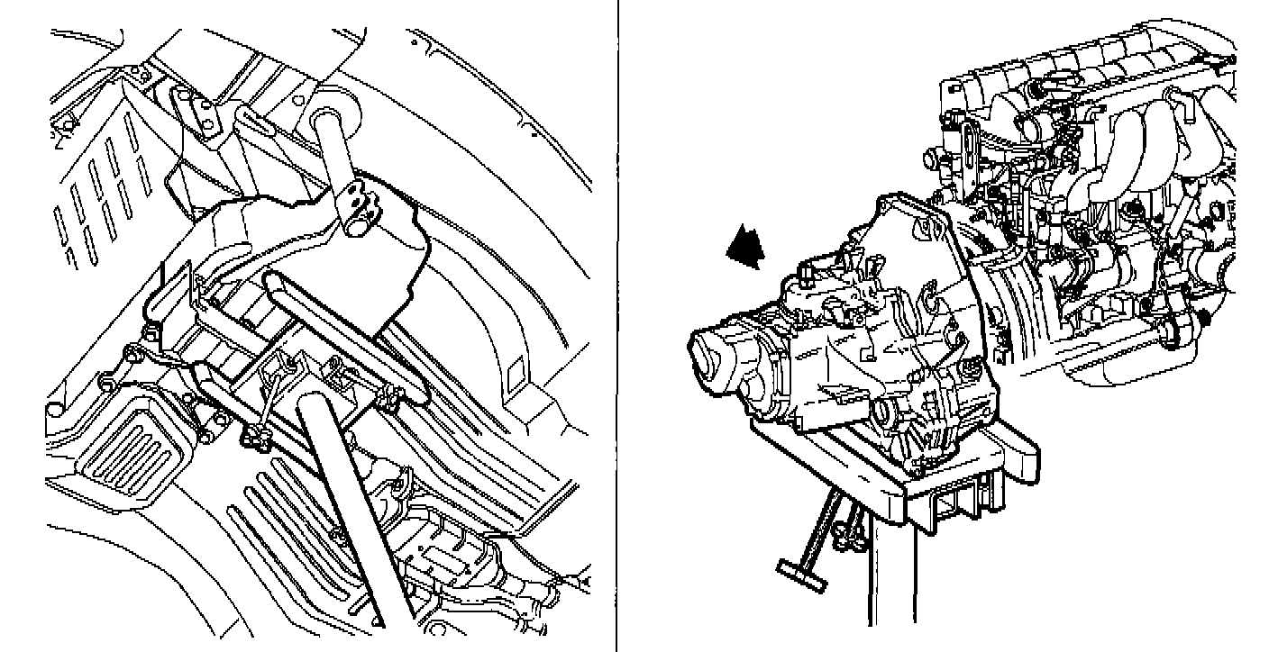 3. Raise transaxle into vehicle to align input shaft to the center of the clutch. Guide transaxle into position, rotate back and forth to align input shaft splines to clutch disc.