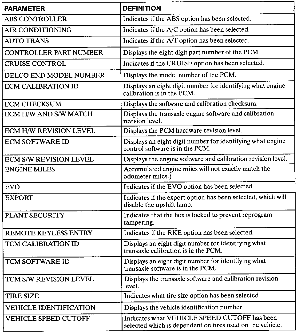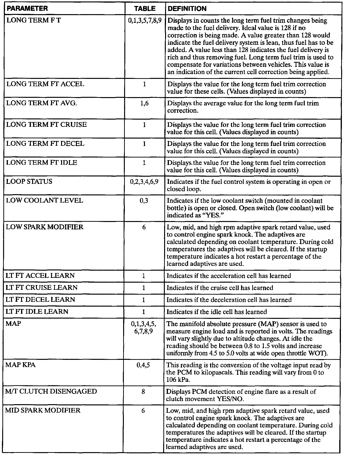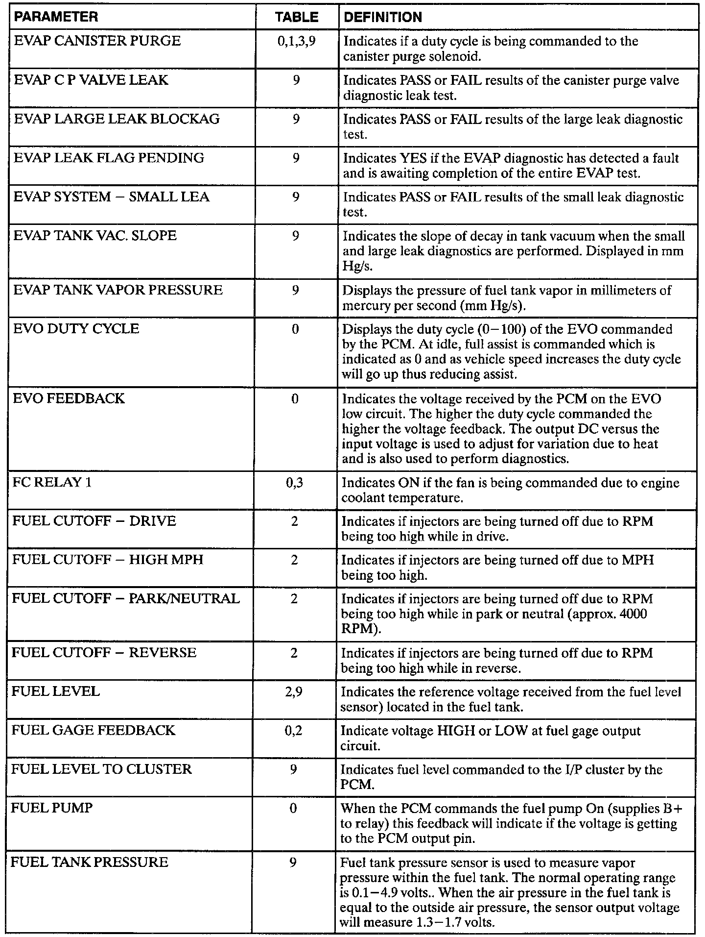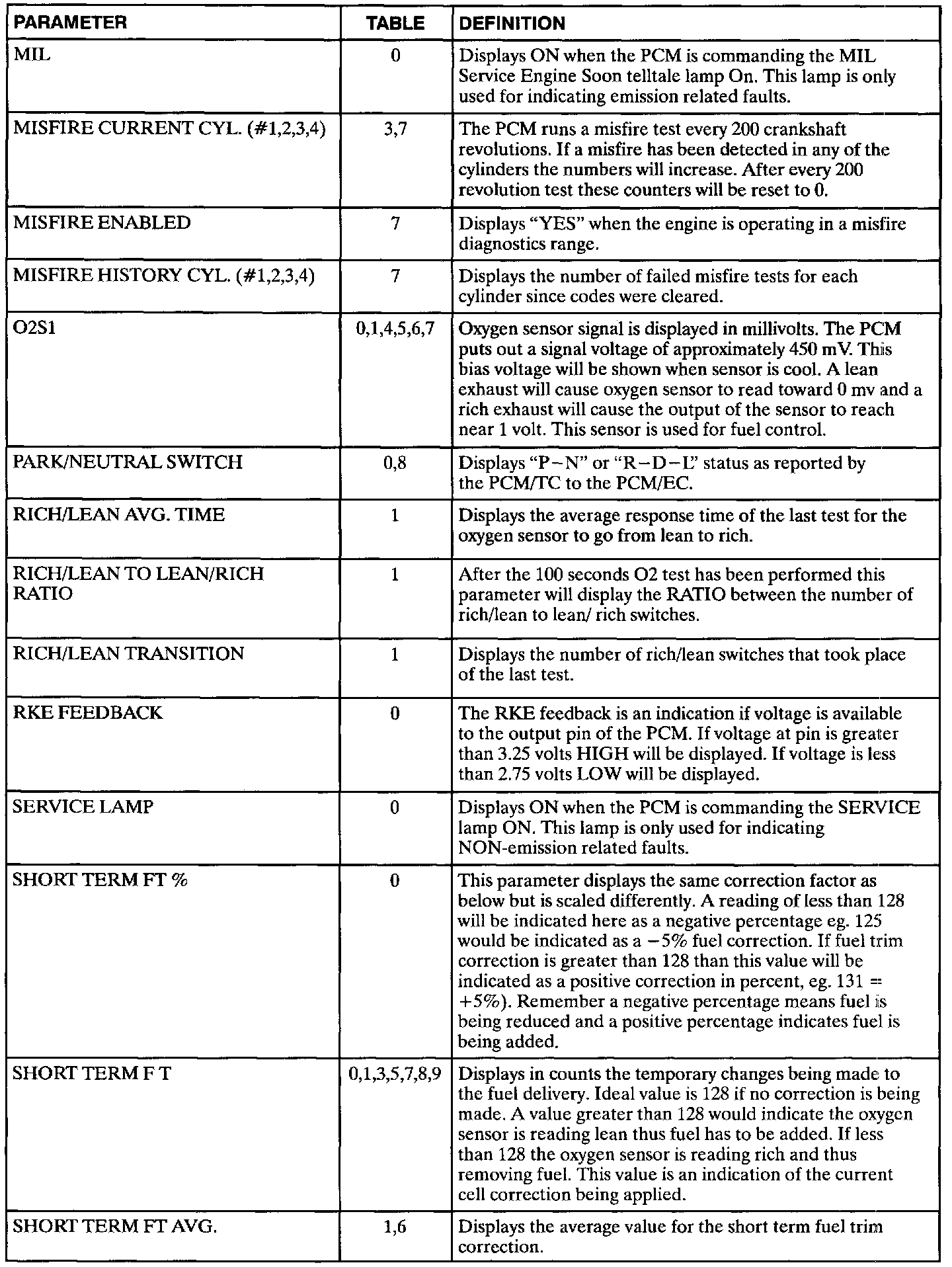 The following data definitions are intended to assist in understanding the data displayed by a Scan tool when it is communicating with the Powertrain Control Module. A thorough understanding of this data will not only aid in diagnosing transaxle related problems, but will also help eliminate unnecessary repairs.The scan tool displays data in several different "tables". Data from a single component is some times displayed in multiple tables. Here is an index for the available tables followed by the actual scan tool data definitions: