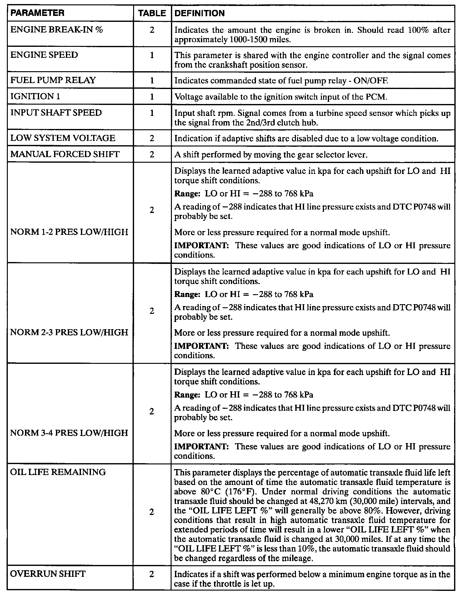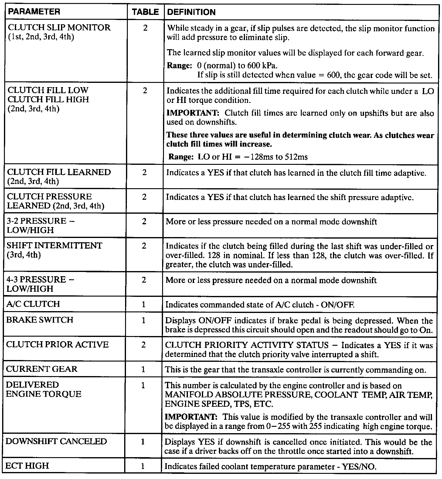 The Transaxle Controller Module (TCM) data definitions shown are intended to assist in understanding the data displayed by a Scan tool when it is communicating with the transaxle controller. A thorough understanding of this data will not only aid in diagnosing transaxle related problems, but will also help eliminate unnecessary repairs.