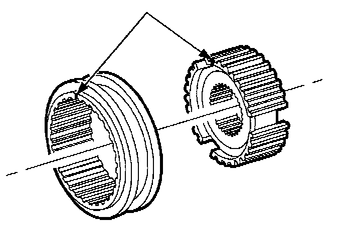 IMPORTANT: Be sure to align the mark on the sleeve to the mark on the hub indicated by the arrows (3/4 synchronizer shown, 5th/Reverse synchronizer similar).