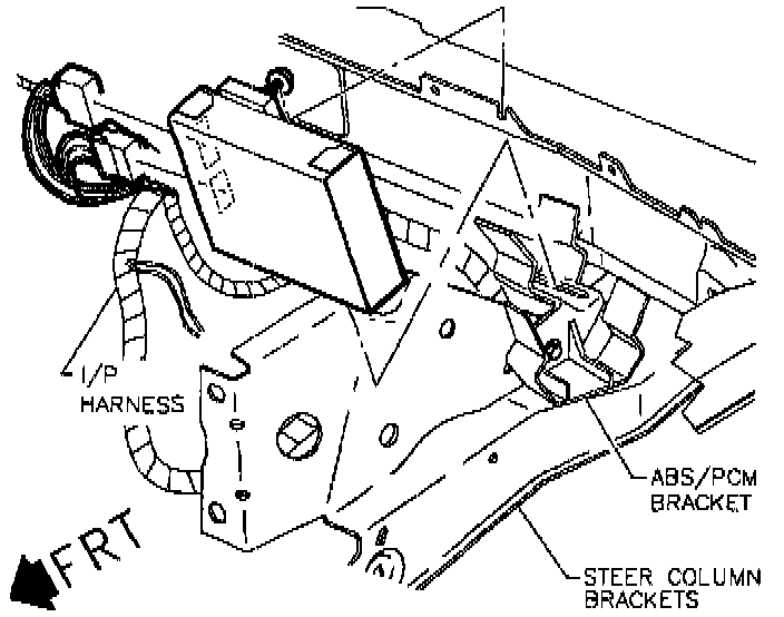 IMPORTANT: The ABS brake control module is located under the I/P top cover, directly over the steering column. The ABS module and PCM are located in the same bracket.