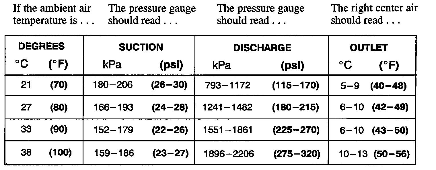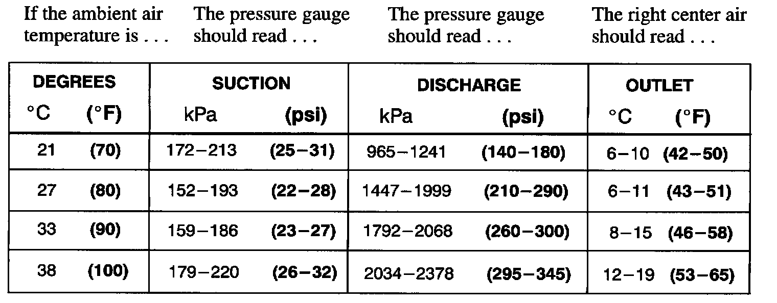 SERVICE STALL TESTRecord the manifold gauge pressures, outlet temperature and ambient air temperature with the following preset vehicle conditions: