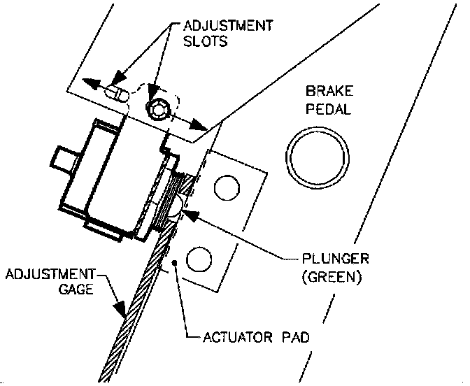 a. If 0.8-1.2 mm (0.03 0.05 in.) of plunger is visible between the switch and the switch actuator pad on the brake pedal arm, the switch is correctly adjusted. The height of the rounded crown of the plunger is equivalent to 1 mm (0.040 in.).