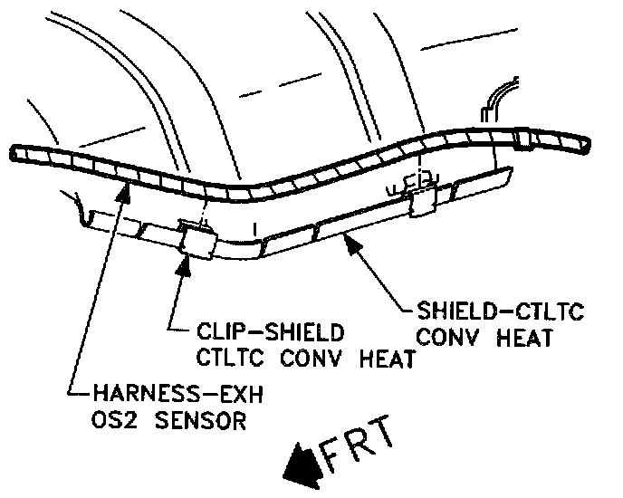 2. Install rear heated oxygen sensor wiring harness into the retaining clips in the trough in the converter heat shield.
