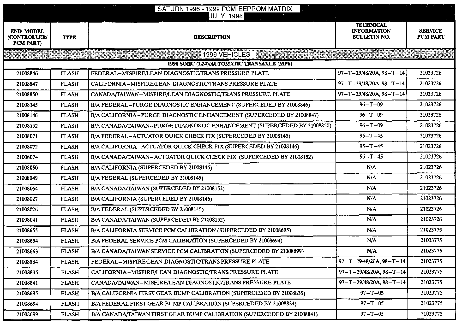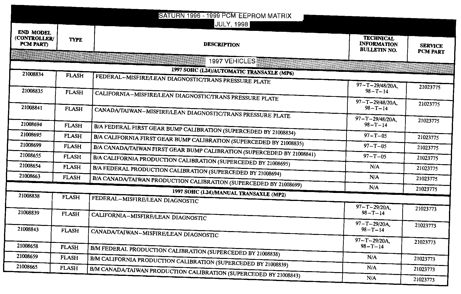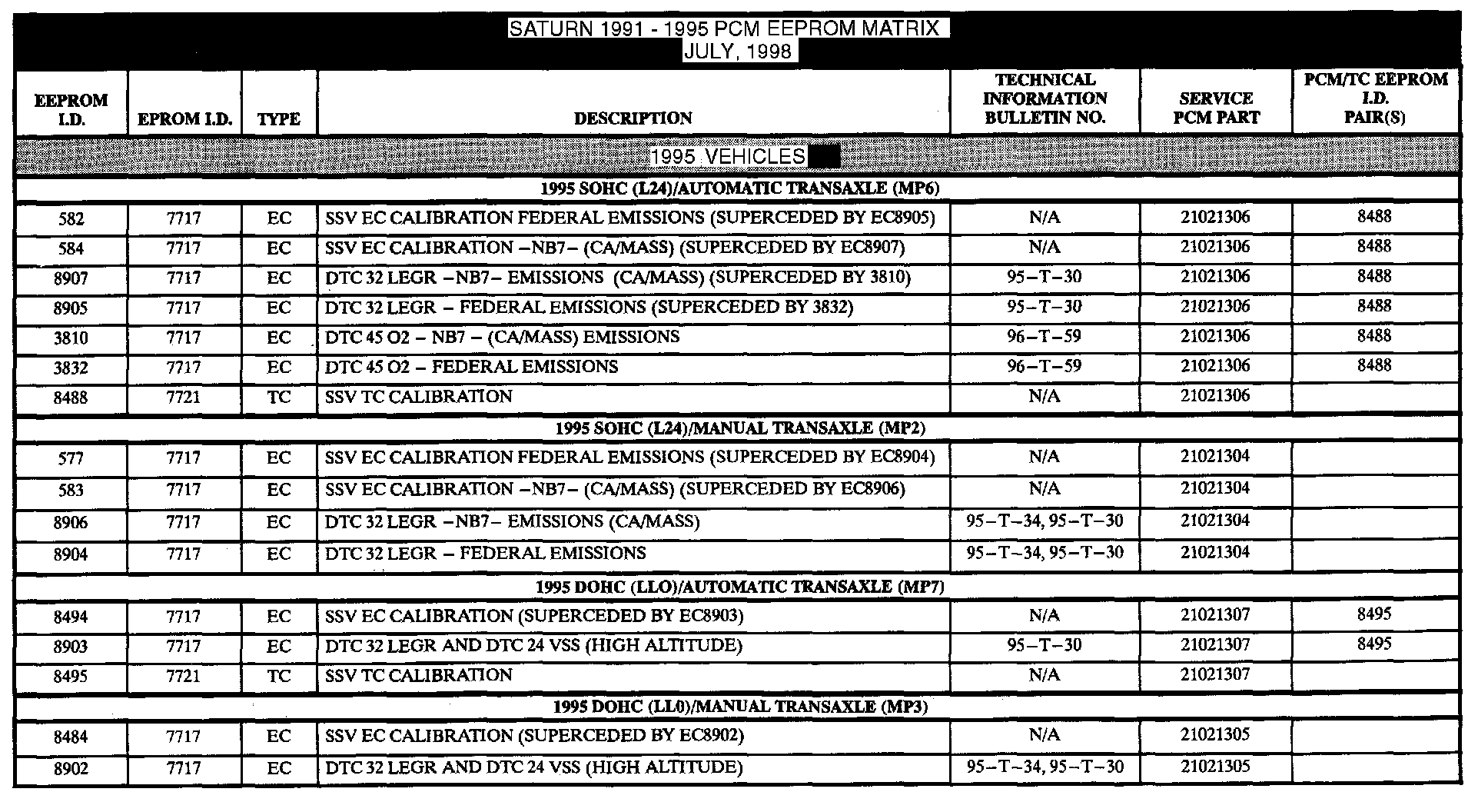 When any diagnosis leads to EEPROM calibration, the Saturn Service Stall System (SSS) EEPROM reprogramming feature will provide a list of valid EEPROM calibrations for the vehicle and allow you to select the appropriate one for reprogramming. The EEPROM calibrations listed on the charts may vary from the (SSS) selections if updates are made by satellite or CD-ROM prior to updating this bulletin.